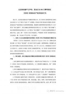 202204-23我公司,北京娱美德知识产权服务有限公司,经《传奇》游戏著作权人株式会社传奇IP(以下称为“传奇IP”)的授权,有权在中国大陆地区对侵犯《传奇》游戏知识产权的侵权...